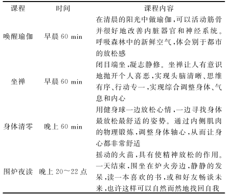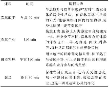 日本森林疗养的成功开展有4个必要条件:通过认证的良好的森林自然资源、科学规范的保健设施、基于森林医学的森林养生功效测定技术和森林疗养师的指导。在满足这四个基本条件的基础上,依据适合人体健康的生理时间设置对应的疗养活动或项目,使人体达到生理和心理平衡之状态,这种模式可以称作“全时疗养模式”。
